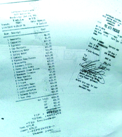 Nel totale compresi 278.10 per vino, tre sambuca e un ama-retto.