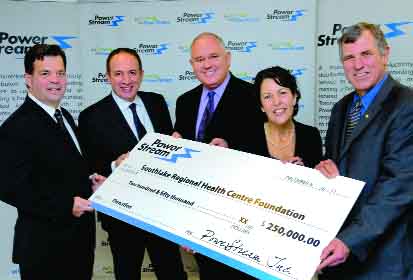 si e’ manifestata con una sostanziosa donazione. Nella foto l’assegno consegnato dal Presidente e CEO di PowerStream Brian Bentz al Presidente del Centro Sanitario Southlake Centre Dr. Dave Williams, nel gruppo si riconoscono i sindaci di Vaughan (Bevilacqua) e Markham (Scarpitti) - rispettivamente vice e Chair del Board di PowerStream - e la Presidente della Fondatione dell’Ospedale Neila Poscente